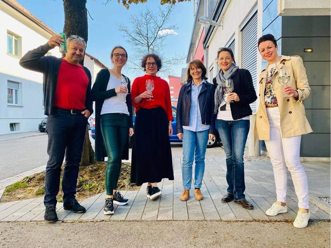 Na fotografiji z nazdravljanja ob prejemu rezultatov (od leve proti desni): Miha Klinar (Sito), vodja partnerstva KCDM 3.0 storitveni design in vodja projekta; Tadeja Trojar Jan (Klin), vodja vsebin usposabljanj; Nika Logar (Sito), vodja komuniciranja; Mojca Mihailovič Škrinjar (Design Business), vodja specialističnih usposabljanj; Ana Struna Bregar (CER Partnerstvo, Ljubljana), vodja partnerstva KCDM 3.0 trajnostni design in Tina Mahne (NEC Cerknica), vodja partnerstva KCDM 3.0 osnove design managementa in vodja projektne pisarne.